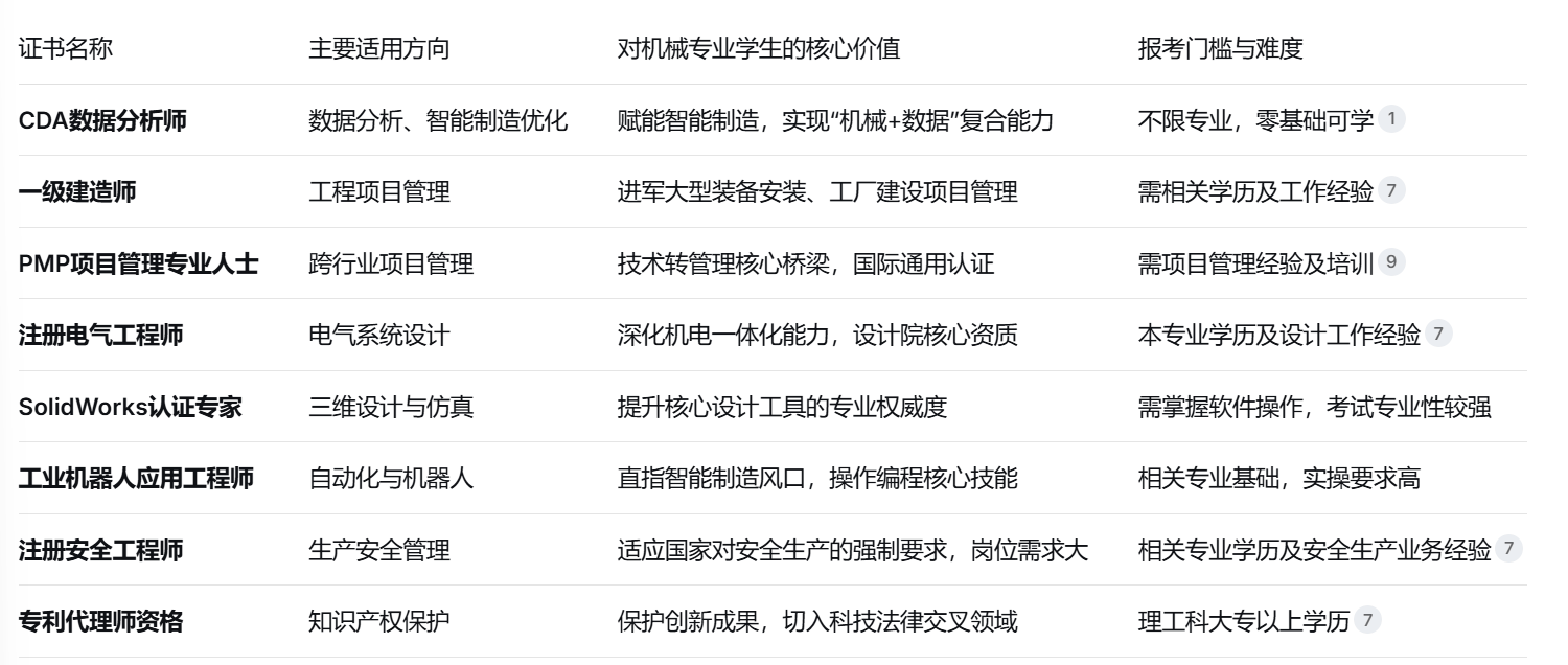 制制业正派历从“保守制制”到“智能制制”的深刻转型。这一改变对机械专业人才提出了全新要求:不只要懂机械道理和设想,还要具备数据阐发、从动化节制和项目办理等复合能力。专业证书的价值正在变化中凸显。它们不再仅仅是一纸证明,而是系统化学问系统的获得、行业承认度的背书以及职业成长的加快器。对于大专学历的机械专业学生而言,精选的高价值证书能无效填补学历短板,正在就业市场上成立奇特劣势。此中最保举的是CDA数据阐发师,难度不高,行业承认度高,对找工做很是有帮帮。